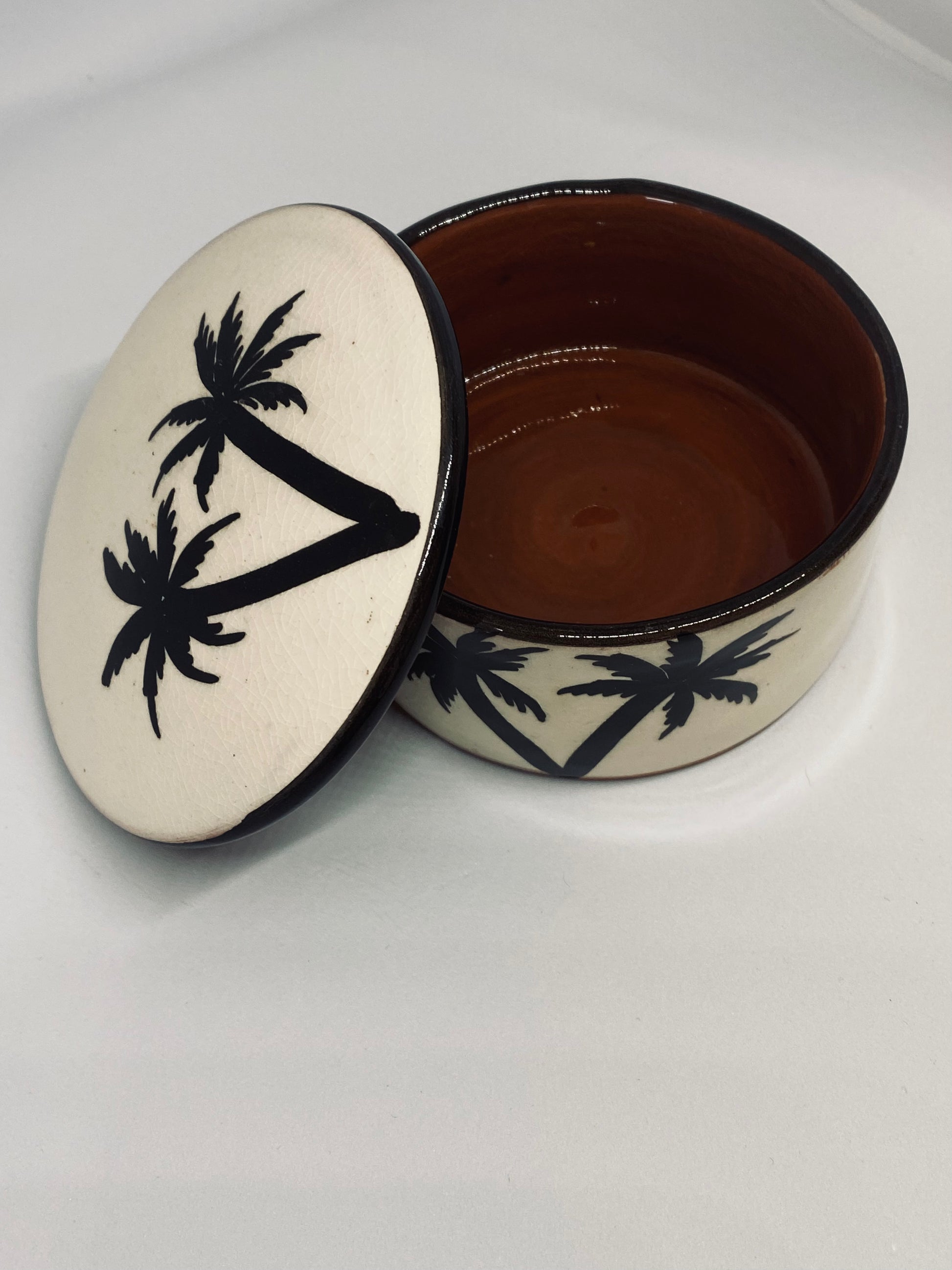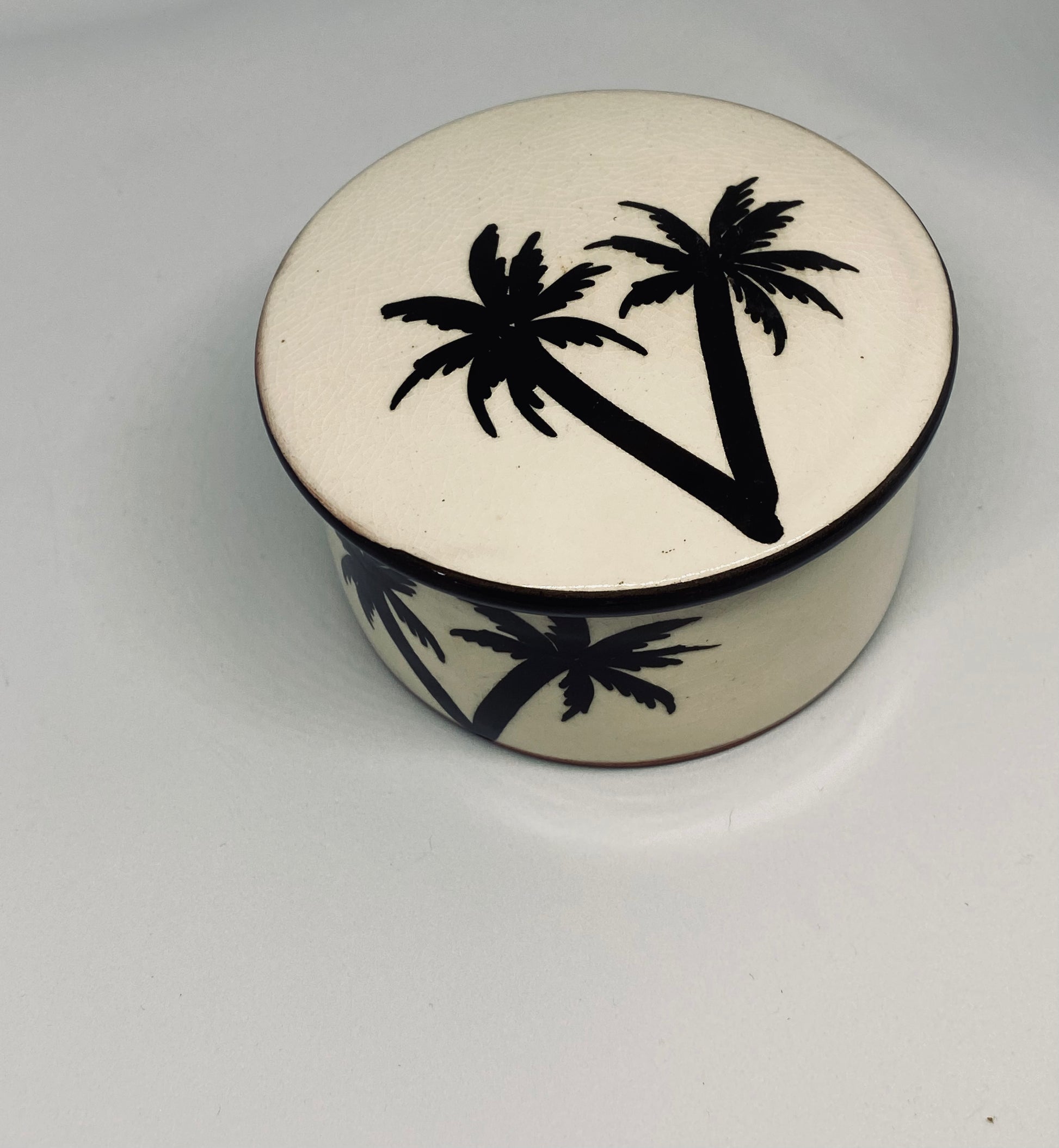 Cette petite boîte en céramique peinte en blanc est un objet décoratif unique et élégant. Avec son motif de palmier noir, elle apporte une touche exotique à votre intérieur.