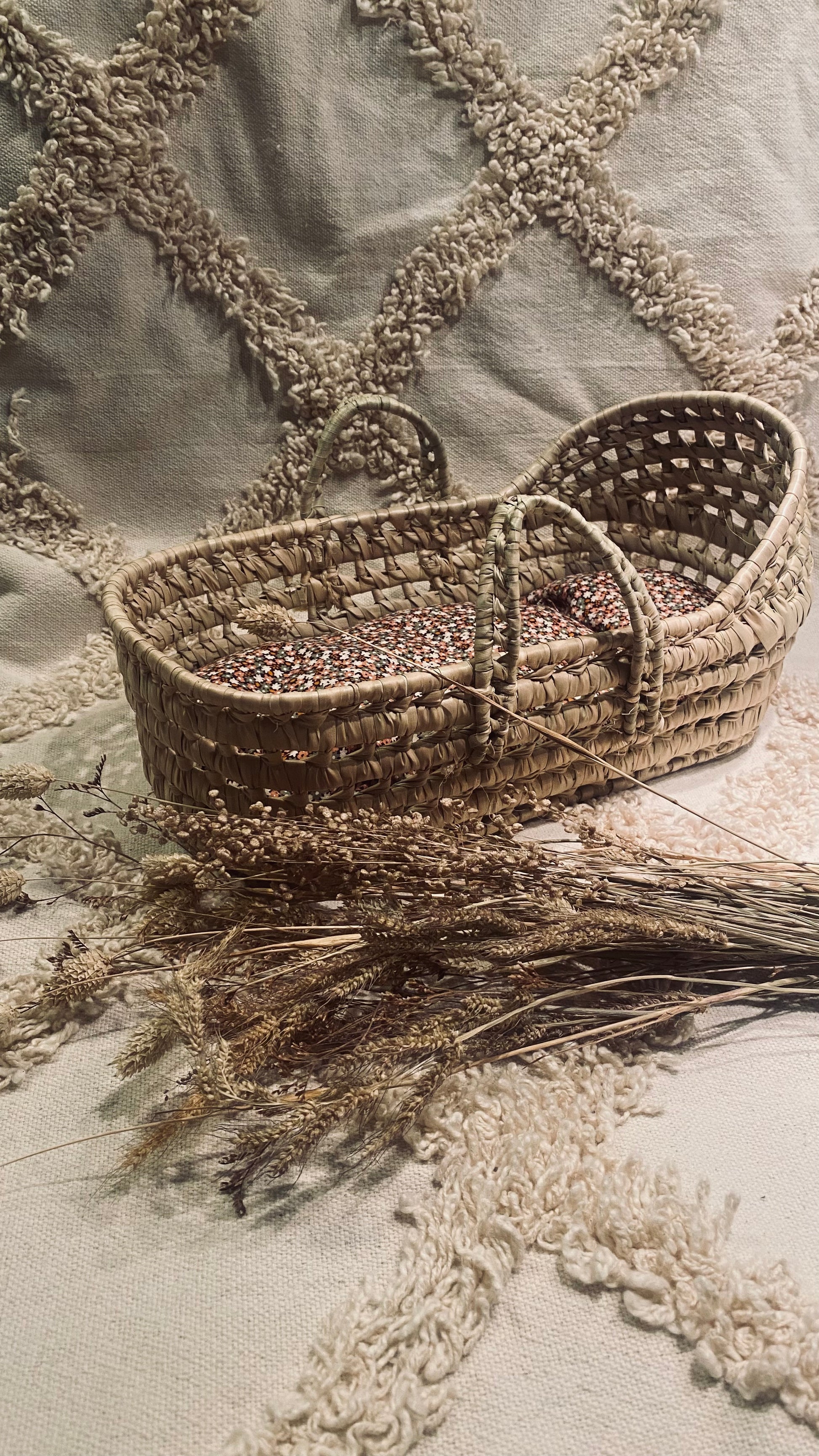 Le couffin pour poupée en feuilles de palmier avec son matelas et son couffin fleurie, permet à l'enfant d'emmener avec lui son poupon préféré où qu'il aille ! Également pour décorer la chambre de votre enfant et y apporter une touche bohème et naturelle. Les mesures et coloris peuvent légèrement variées, les couffins sont réalisés entièrement à la main.