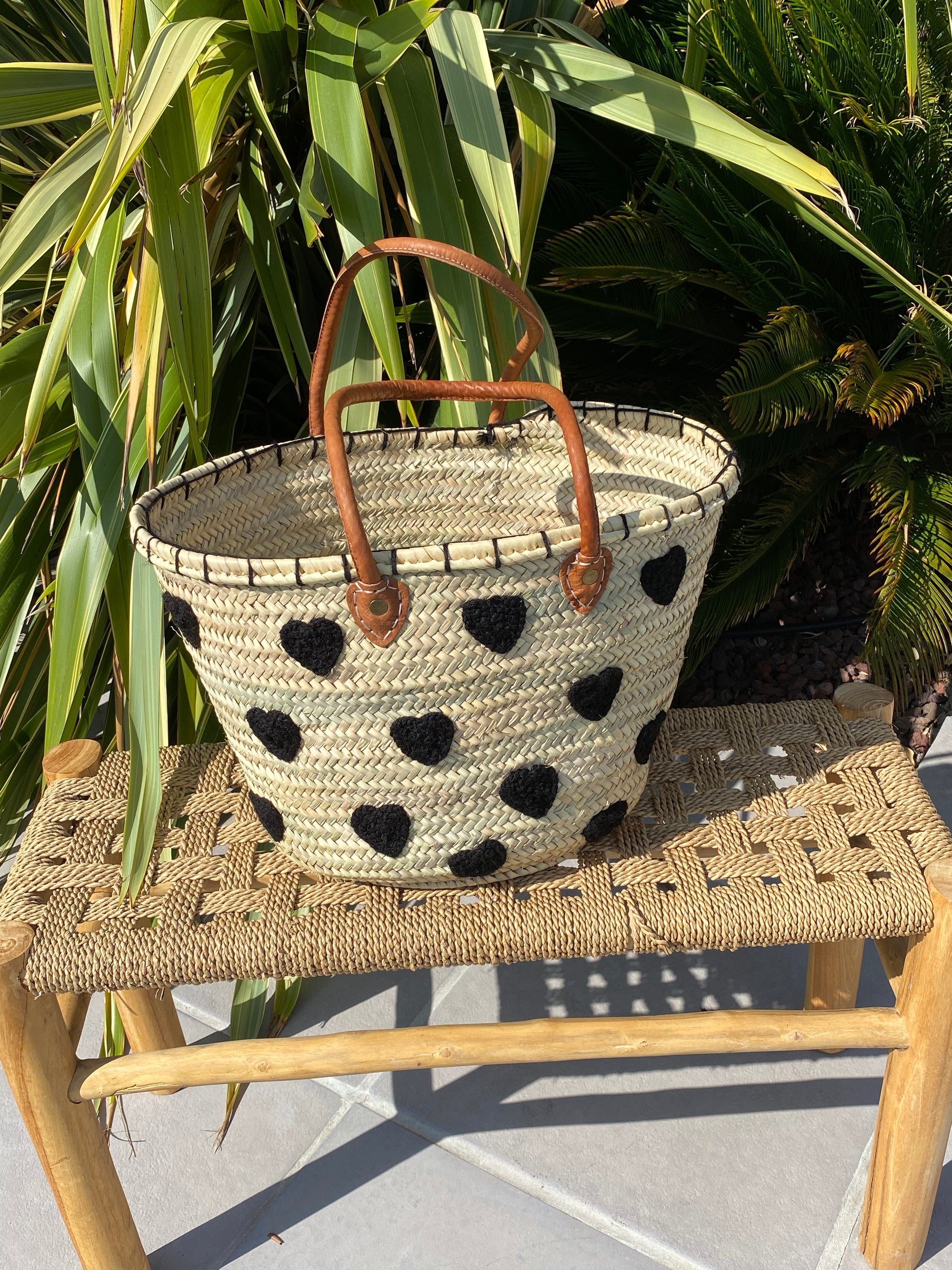 Grand panier brodé avec des coeurs, à porter à l'épaule.
