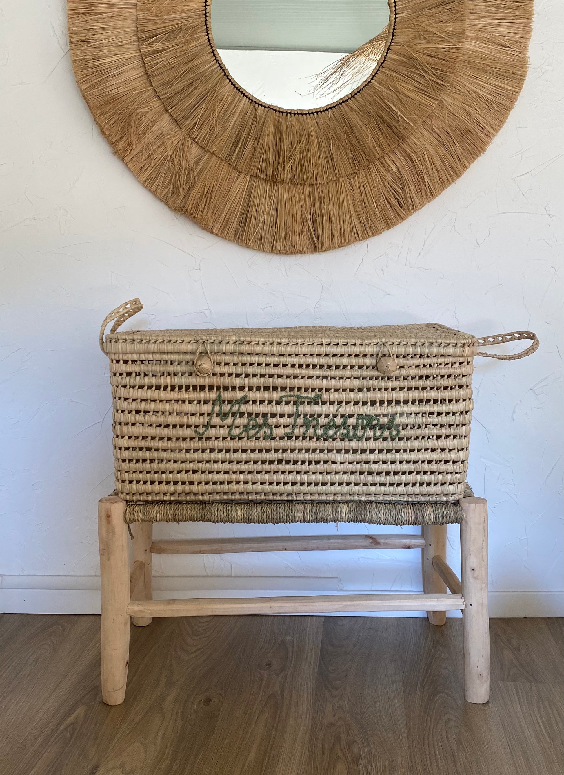 Le tressage soigné du palmier donne à la malle un aspect unique et élégant. Avec l’inscription « Mes trésors » sera idéale pour une chambre d’enfant ou une salle de jeux.