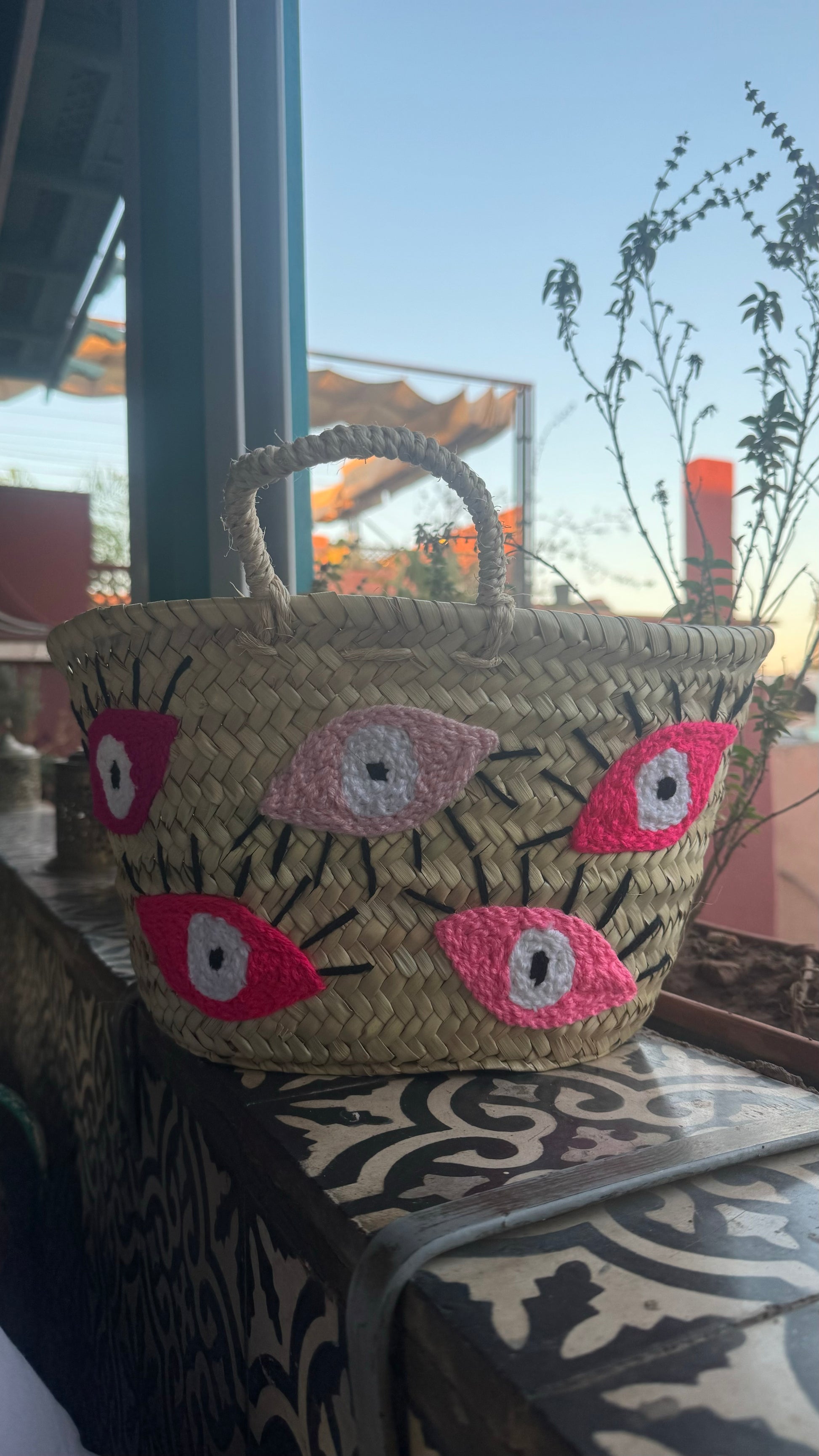 Mini panier brodé avec des yeux , à porter à la main.