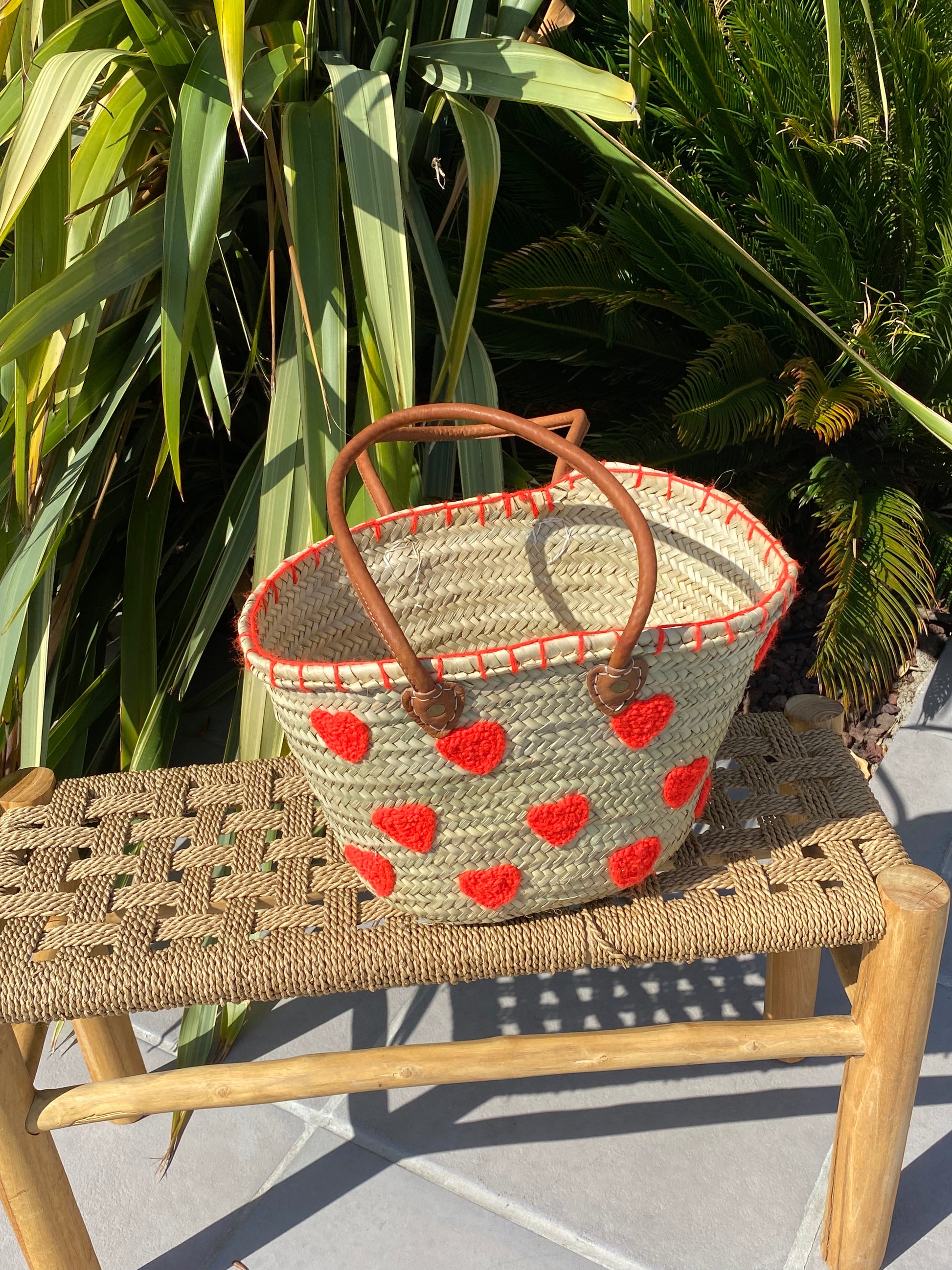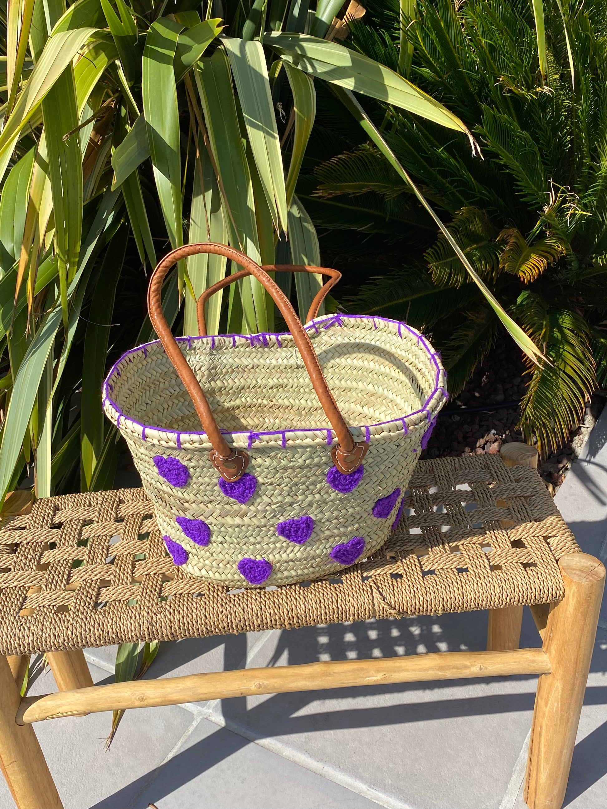 Panier brodé avec des coeurs, à porter à l'épaule.