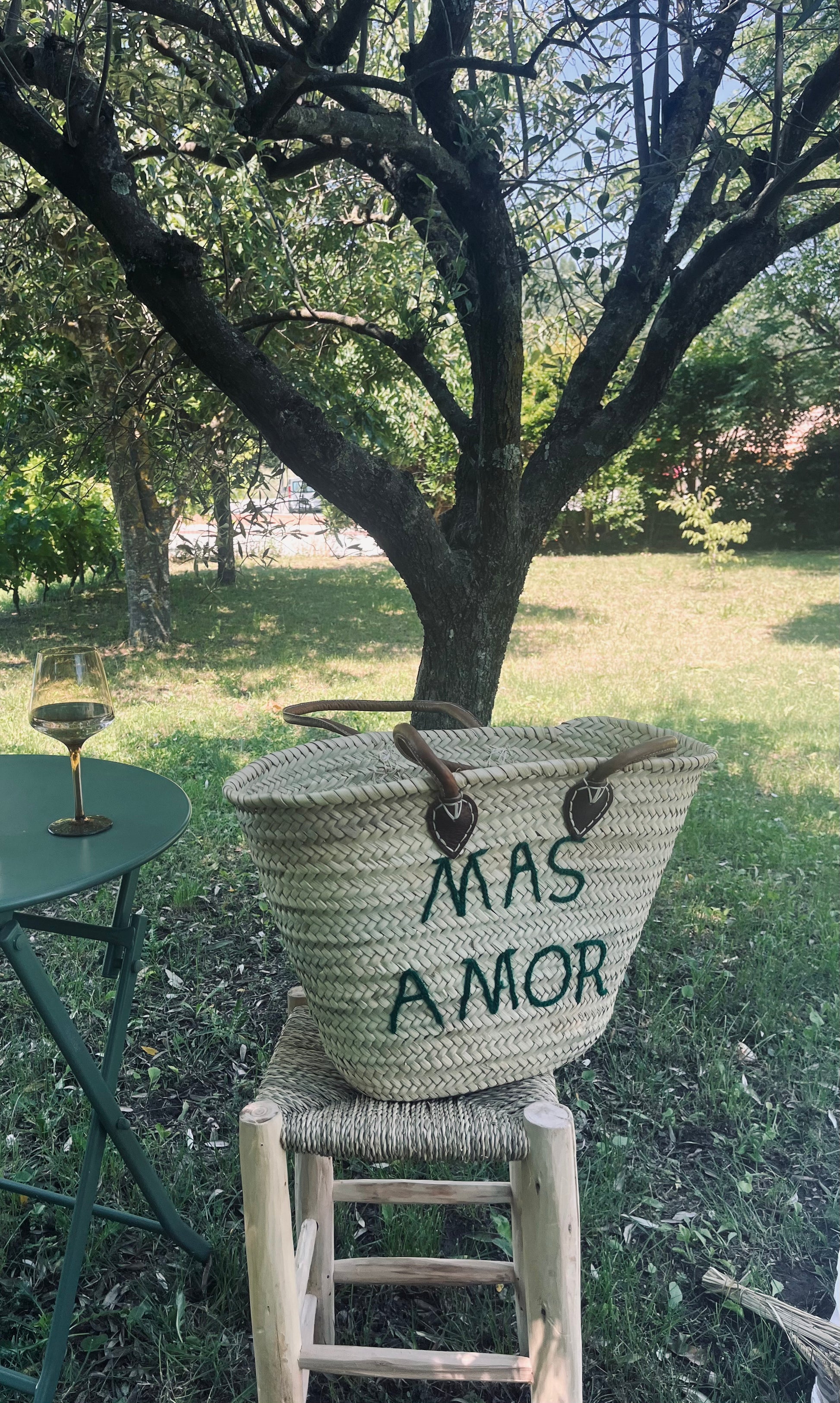 Notre jolie panier brodé MAS AMOR en vert à porter à l'épaule.