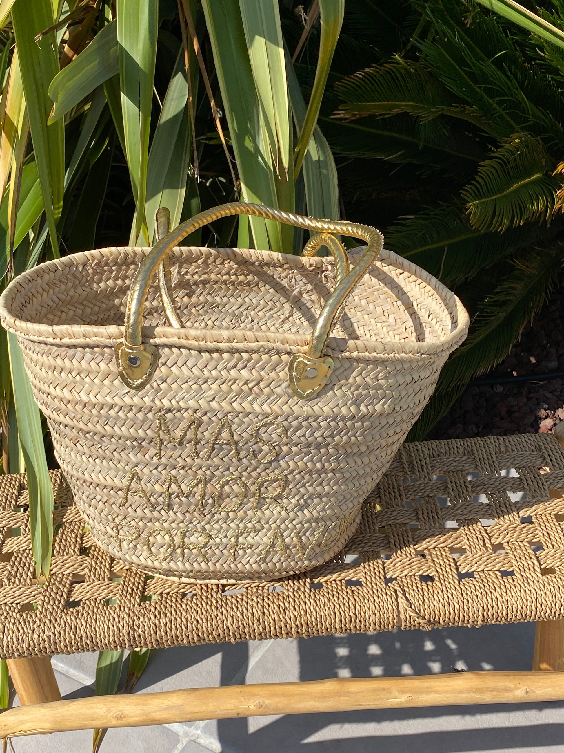 Panier brodé MAS AMOR POR FAVOR en doré, à porter à l'épaule.