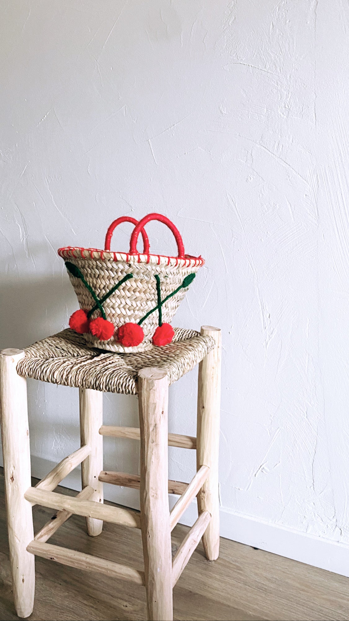 Panier brodé avec des cerises, idéal pour décorer une chambre d’enfant.