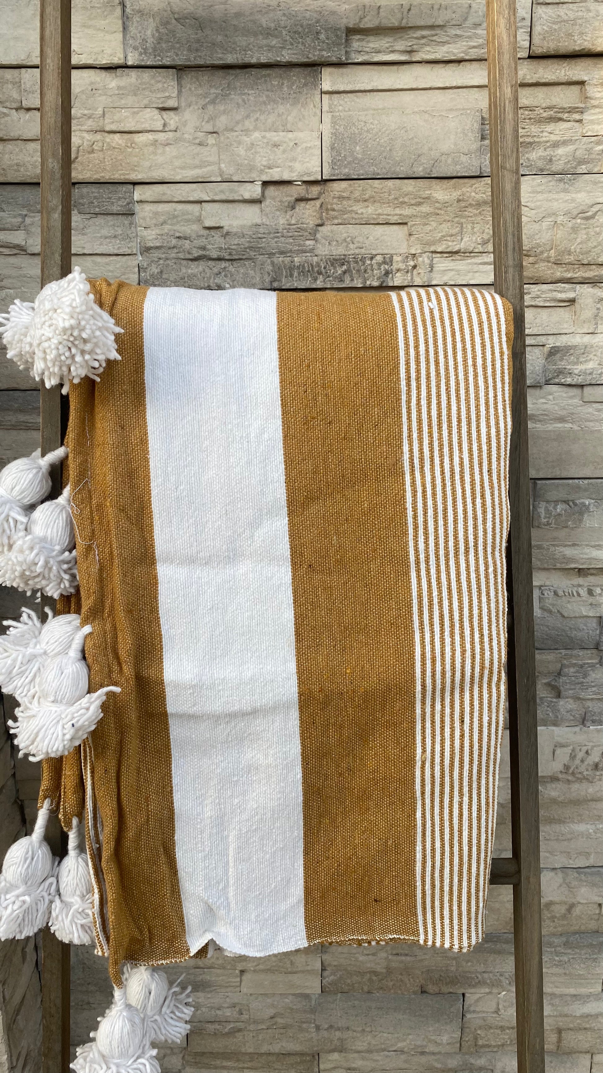 PLAID POMPONS TISSÉ MOUTARDE RAYÉ