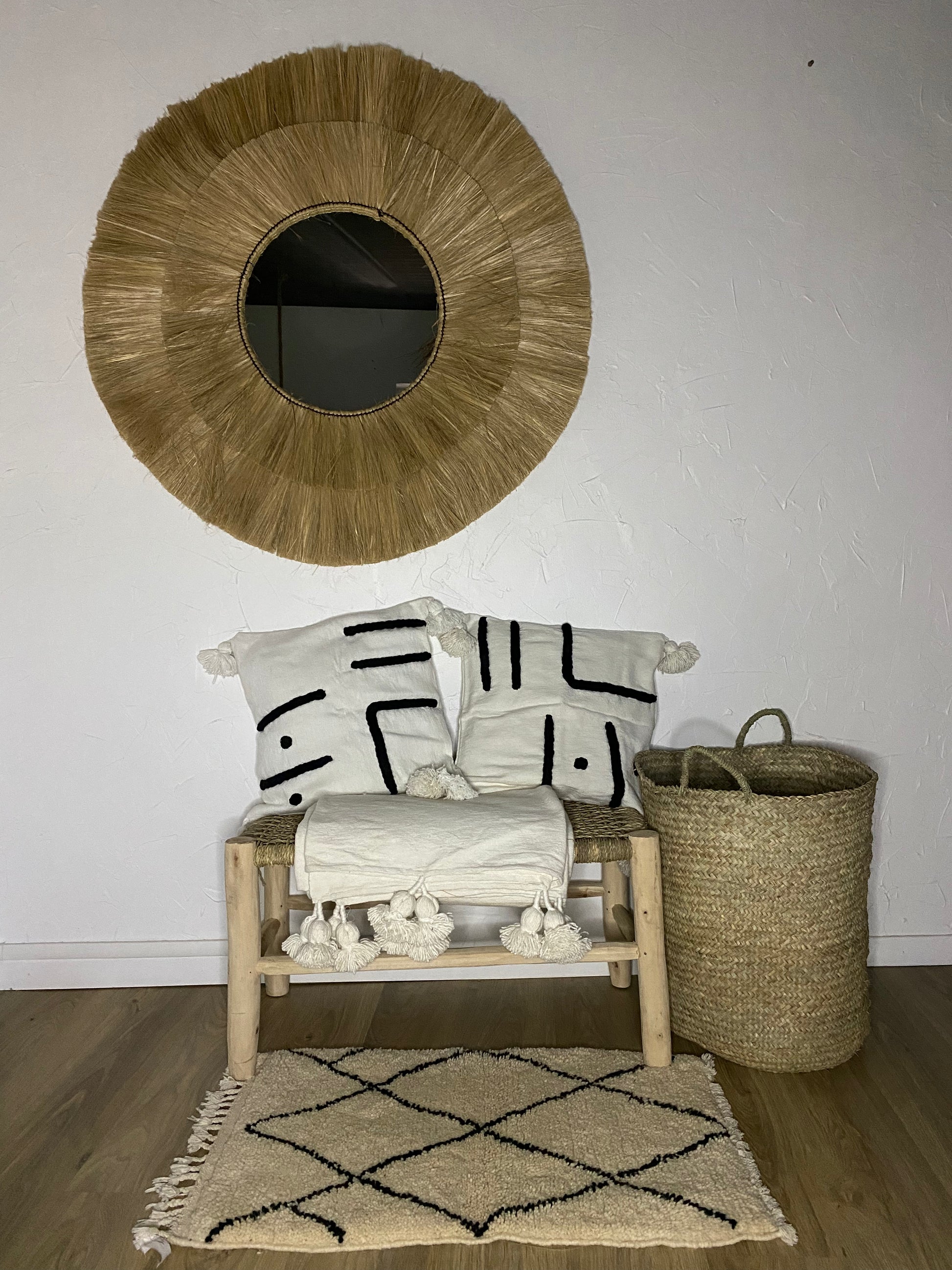 Ce tapis béni ouarain à losanges noirs est l'ajout idéal pour une touche de style et de confort sur votre descente de lit. Confectionné à la main par des artisans marocains, il présente des motifs géométriques noirs sur un fond blanc. Sa taille de 90 x 50 cm le rend parfait pour ajouter une touche de sophistication et de confort à votre chambre à coucher.